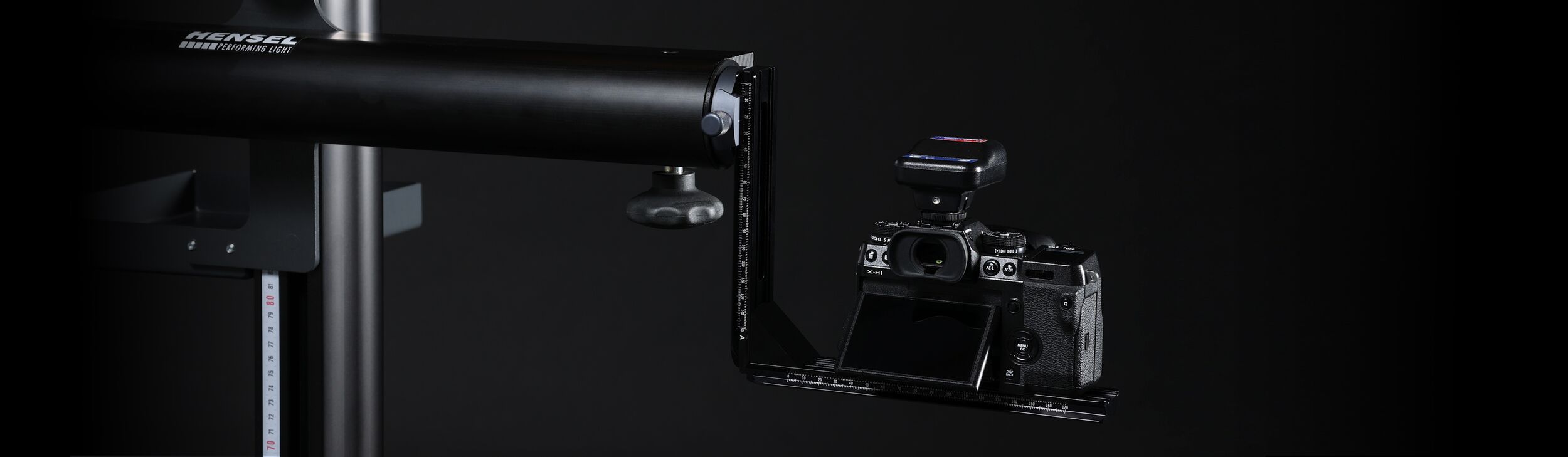 Das Hensel Studio Camera Stand hat die perfekte Größe für Ihr Studio. Die Kamera lässt sich leichtgängig und stufenlos horizontal und vertikal verschieben. Die aufgebrachten Skalen ermöglichen eine präzise Repositionierung der Kamera.